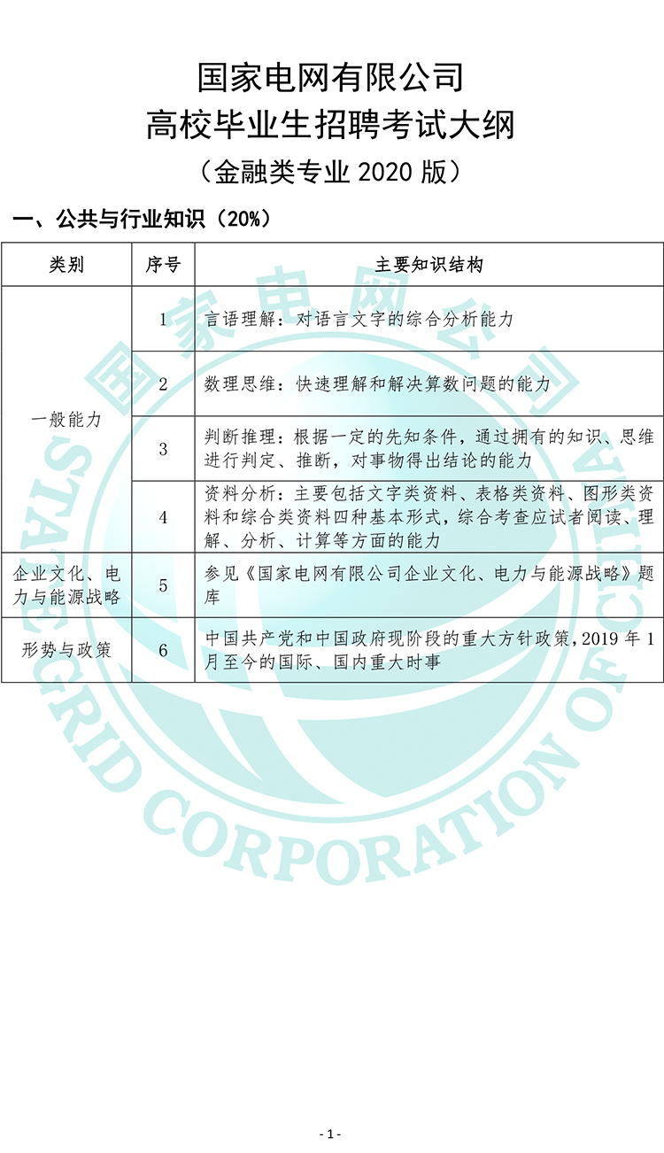 2020國家電網公司高校畢業生招聘考試大綱(金融類專業2020版)